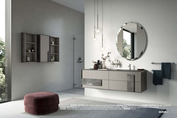 QAMAR RAFFAELLO wall unit_pietra grigia glossy porcelain stoneware / platino. TOUCH accessories_chrome-plated / satined glass.