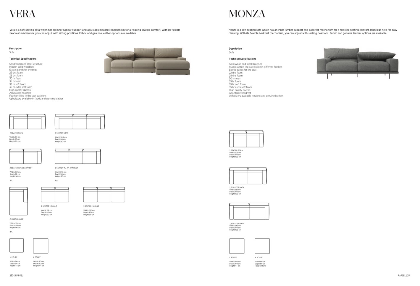 Monza is a soft seating sofa which has an inner lumbar support and backrest mechanism for a relaxing seating comfort. High legs help for easy