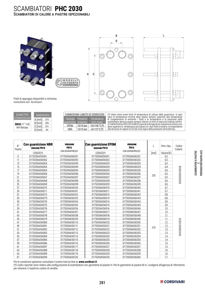 (*)I codici riportati sono relativi alla configurazione di scambiatore con geometria di piastre H. Per le geometrie di piastre M e L rivolgersi all’agenzia di riferimento