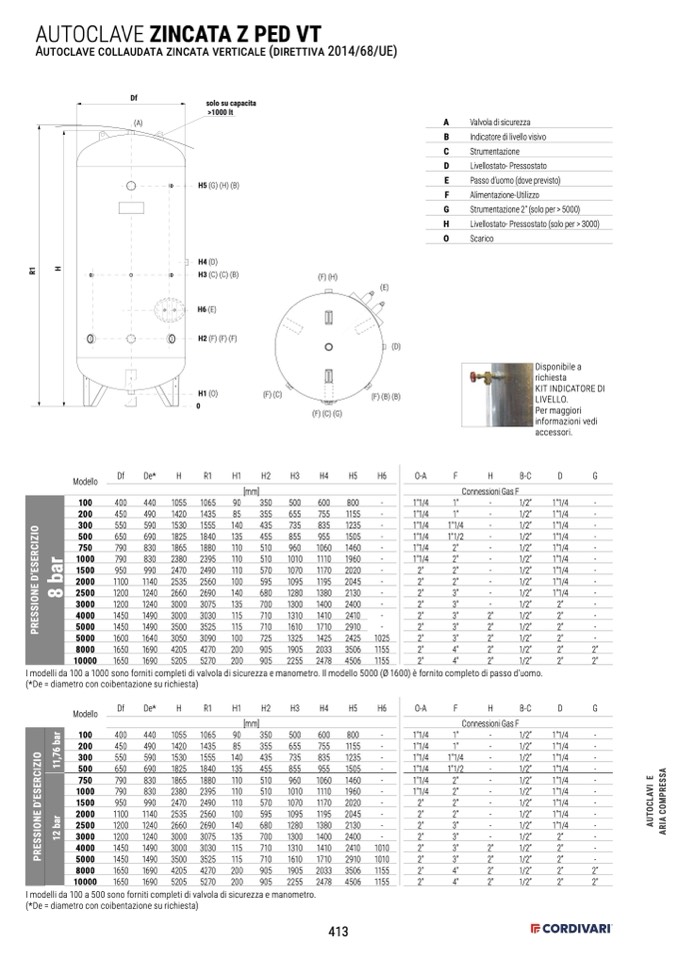 I modelli da 100 a 1000 sono forniti completi di valvola di sicurezza e manometro. Il modello 5000 (Ø 1600) è fornito completo di passo d'uomo.