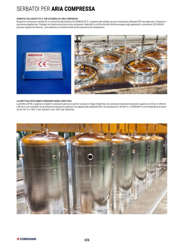 Recipienti in pressione marcati CE in conformità alla Direttiva 2014/68/UE P.E.D. La gamma dei serbatoi per aria compressa collaudati PED raccoglie tutti i recipienti in