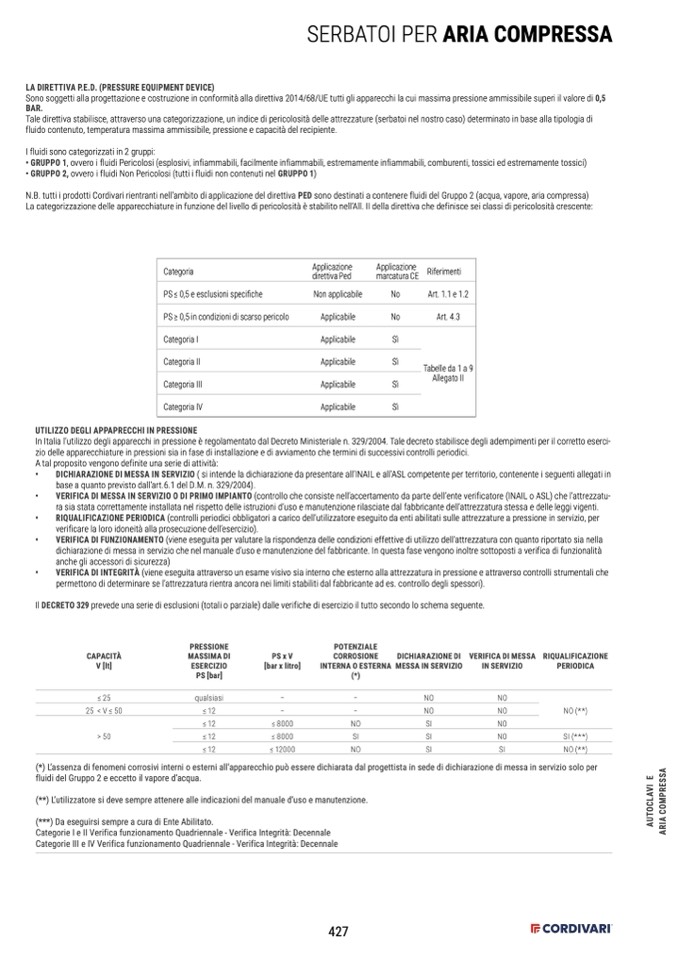 N.B. tutti i prodotti Cordivari rientranti nell’ambito di applicazione del direttiva PED sono destinati a contenere fluidi del Gruppo 2 (acqua, vapore, aria compressa)