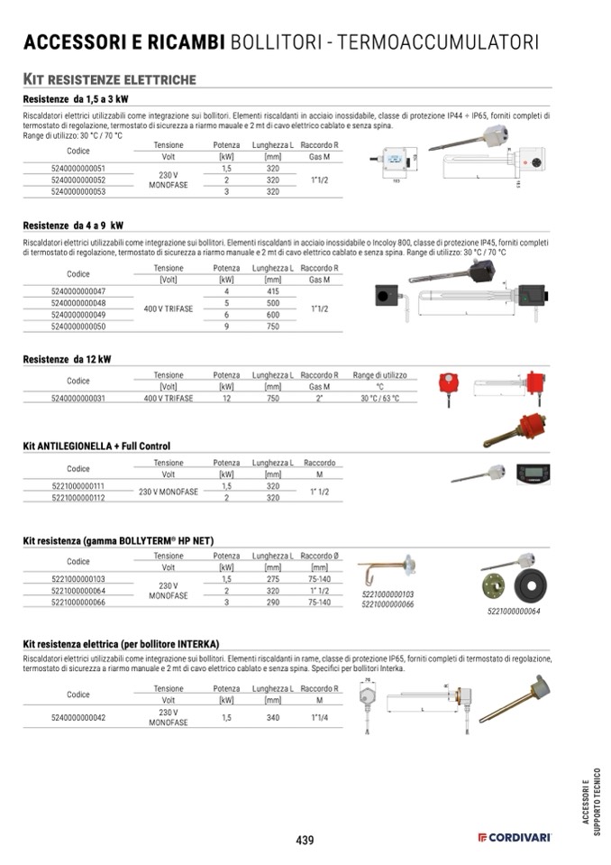 Riscaldatori elettrici utilizzabili come integrazione sui bollitori. Elementi riscaldanti in acciaio inossidabile, classe di protezione IP44 ÷ IP65, forniti completi di