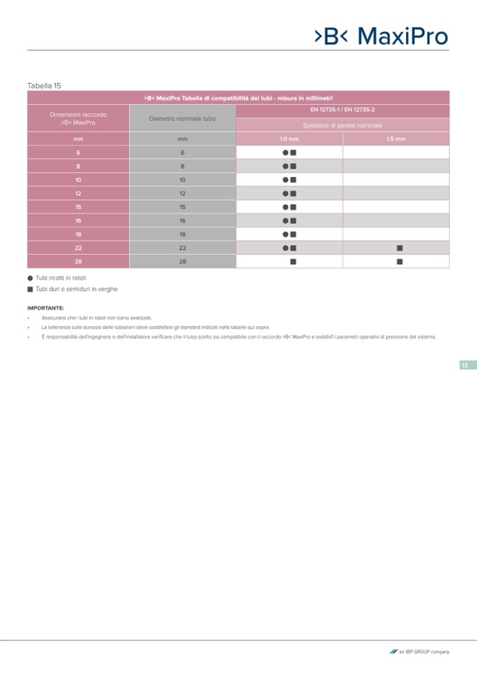 È responsabilità dell'ingegnere o dell'installatore verificare che il tubo scelto sia compatibile con il raccordo >B< MaxiPro e soddisfi i parametri operativi di pressione del sistema.