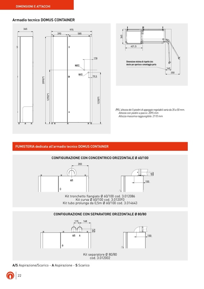 (*) L’altezza dei 5 piedini di appoggio regolabili varia da 35 a 50 mm.