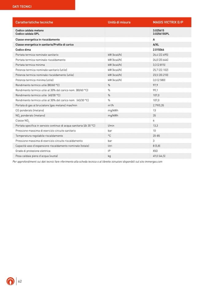 Per approfondimenti sui dati tecnici fare riferimento alla scheda tecnica o al libretto istruzioni disponibili sul sito immergas.com