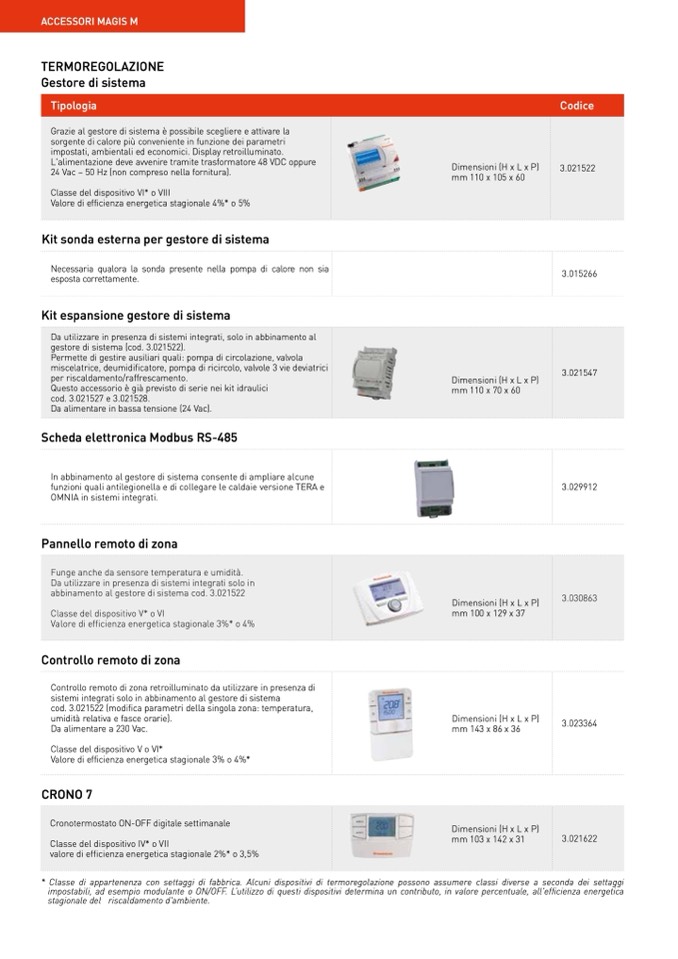 * Classe di appartenenza con settaggi di fabbrica. Alcuni dispositivi di termoregolazione possono assumere classi diverse a seconda dei settaggi