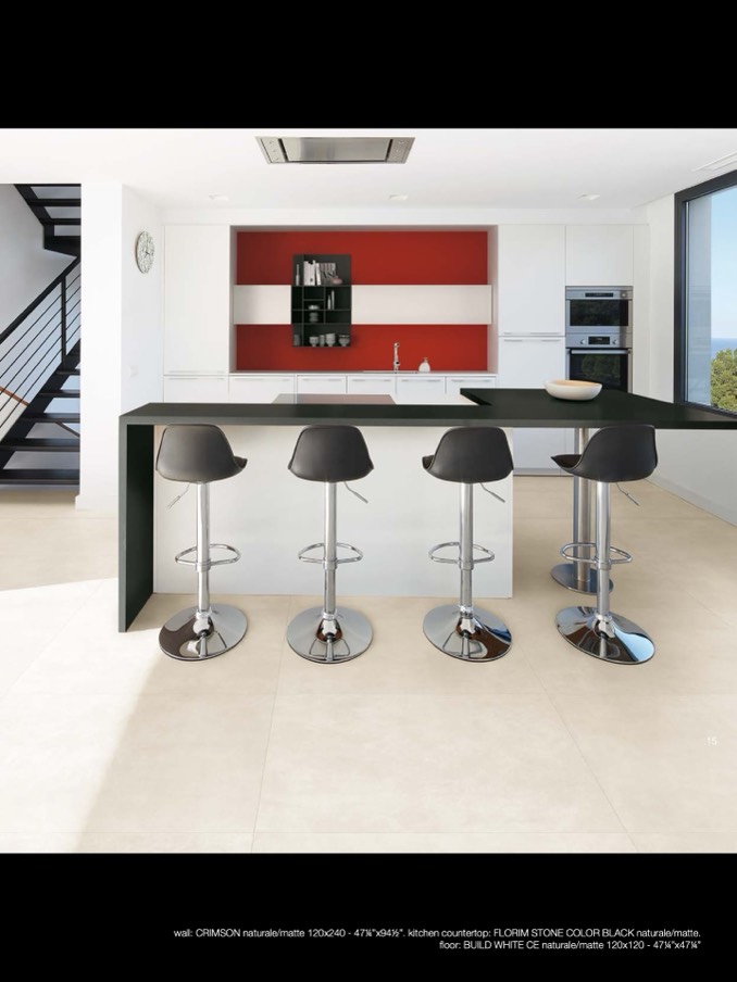 wall: CRIMSON naturale/matte 120x240 - 474”x942”. kitchen countertop: FLORIM STONE COLOR BLACK naturale/matte.