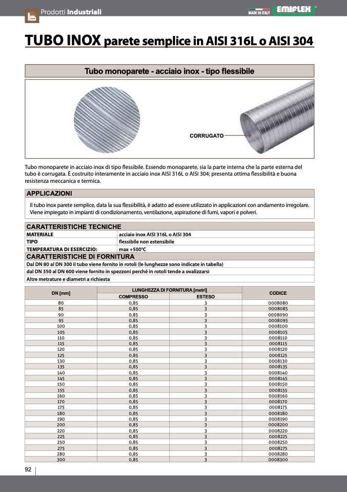 tubo è corrugata. È costruito interamente in acciaio inox AISI 316L o AISI 304; presenta ottima flessibilità e buona