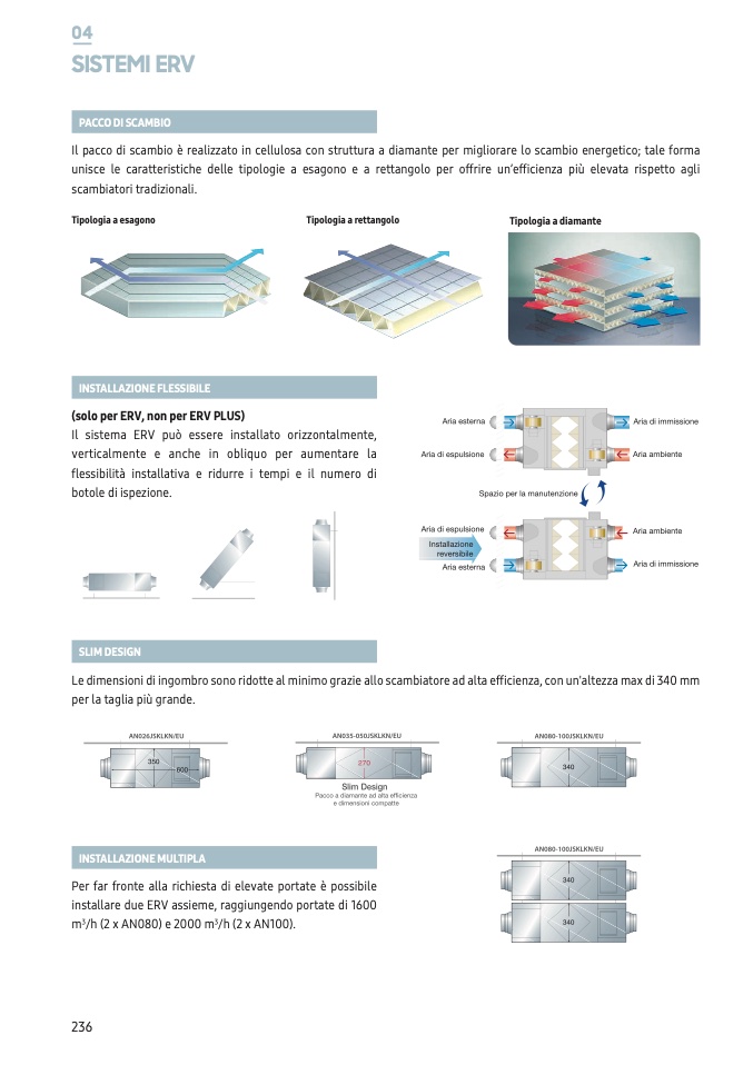 Il pacco di scambio è realizzato in cellulosa con struttura a diamante per migliorare lo scambio energetico; tale forma