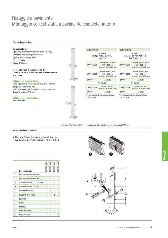 Staffa a pavimento per altezza 600, 750, 900 e 954 mm