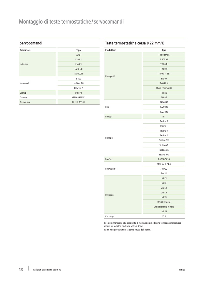 Le liste si riferiscono alla possibilità di montaggio delle testine termostatiche / servoco-