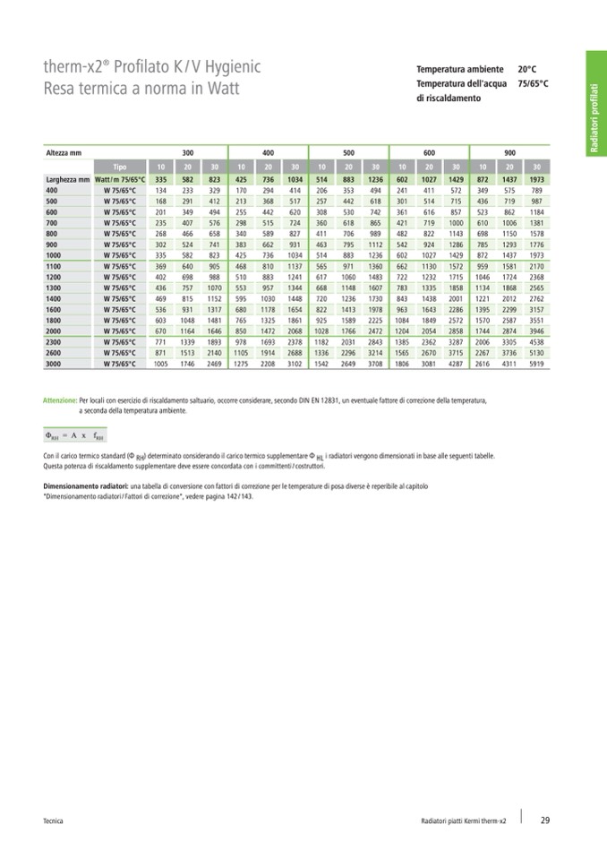 Con il carico termico standard (Φ RH) determinato considerando il carico termico supplementare Φ HL i radiatori vengono dimensionati in base alle seguenti tabelle.