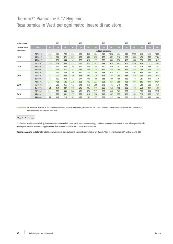 Con il carico termico standard (Φ RH) determinato considerando il carico termico supplementare Φ HL i radiatori vengono dimensionati in base alle seguenti tabelle.