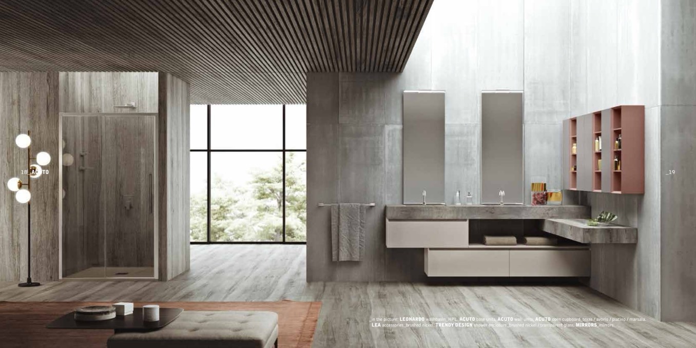 _in the picture: LEONARDO washbasin_HPL. ACUTO base units, ACUTO wall units, ACUTO open cupboard_texas / avorio / platino / marsala.