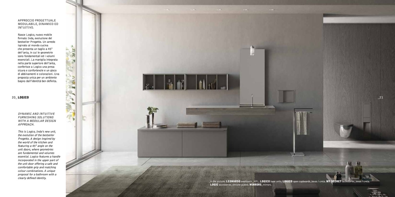 _in the picture: LEONARDO washbasin_HPL. LOGICO base units, LOGICO open cupboards_texas / creta. MY SECRET accessories_texas / creta.