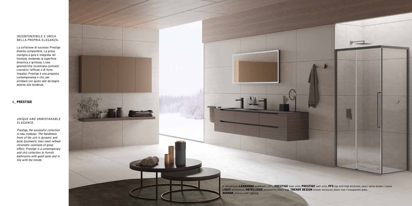 _in the picture: LEONARDO washbasin_HPL. PRESTIGE base units, PRESTIGE wall units, PFS top with high thickness_lava / larice brown / cacao.