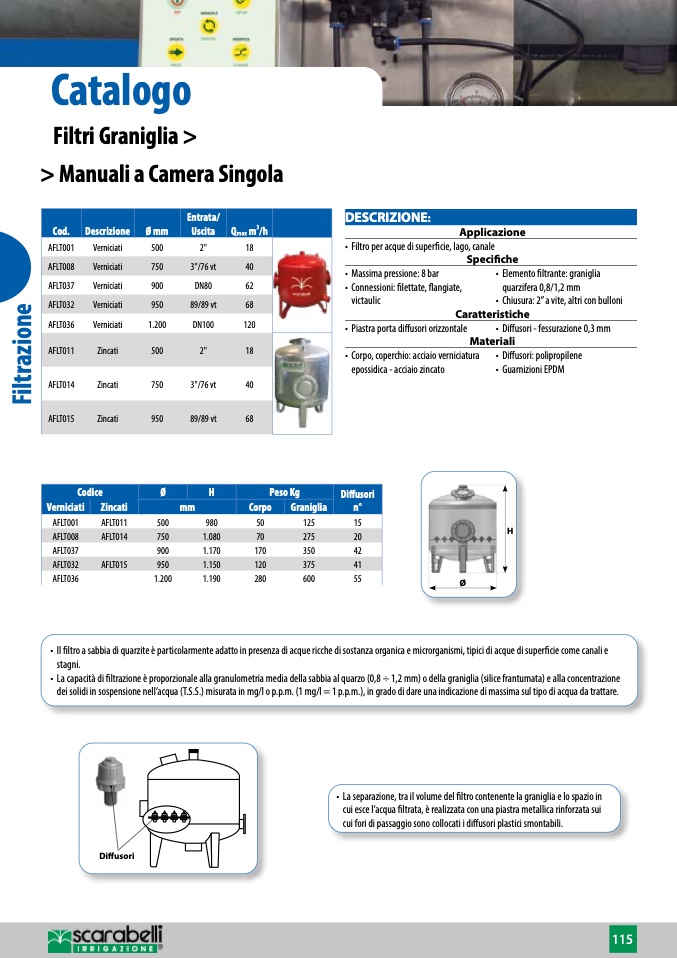 • Il filtro a sabbia di quarzite è particolarmente adatto in presenza di acque ricche di sostanza organica e microrganismi, tipici di acque di superficie come canali e