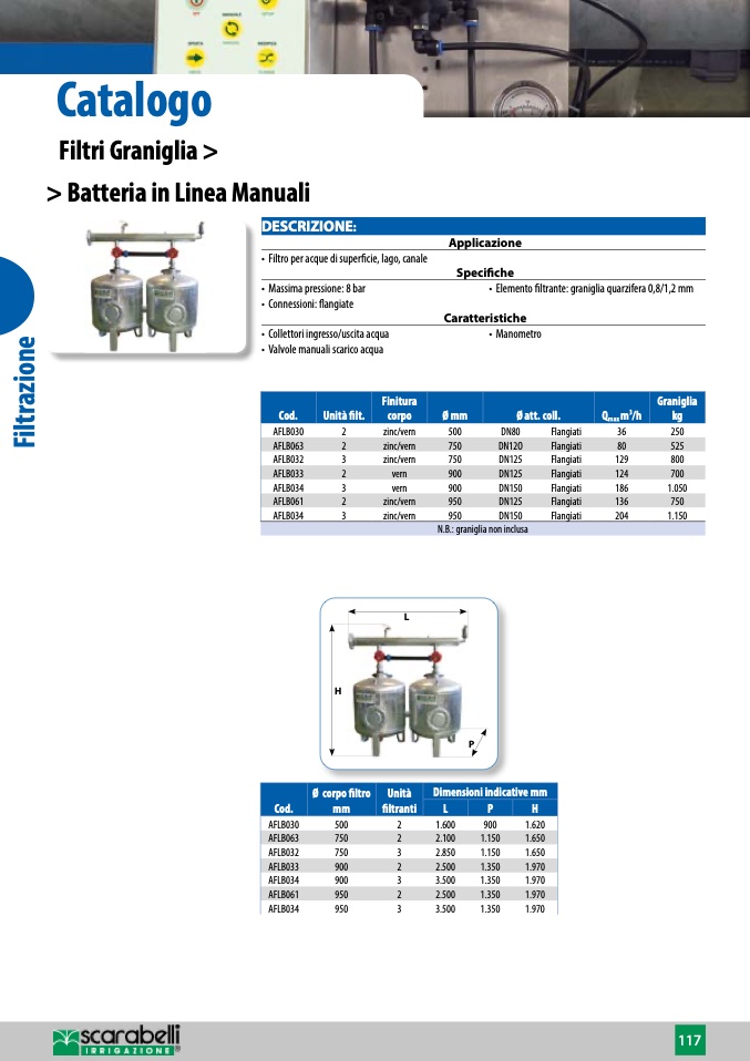 • Elemento filtrante: graniglia quarzifera 0,8/1,2 mm