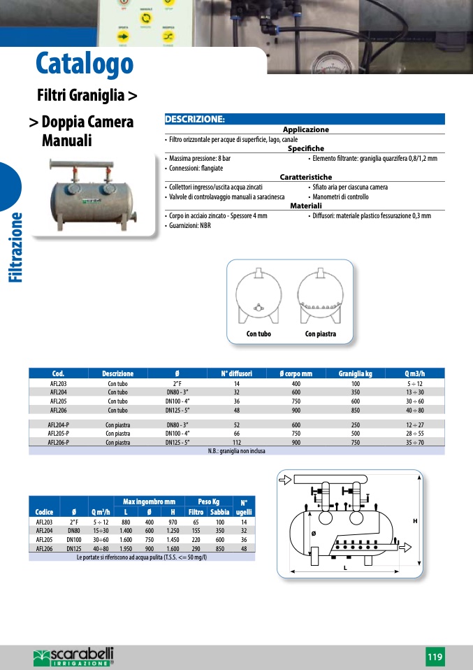• Elemento filtrante: graniglia quarzifera 0,8/1,2 mm