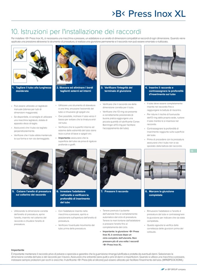 Per installare >B< Press Inox XL, è necessaria una macchina a pressare, un adattatore e un anello di dimensioni compatibili ai raccordi di ogni dimensione. Quando viene