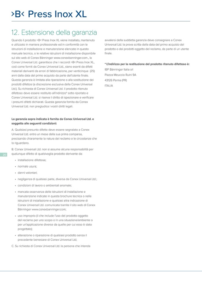 Conex Universal Ltd. garantisce che i raccordi >B< Press Inox XL,