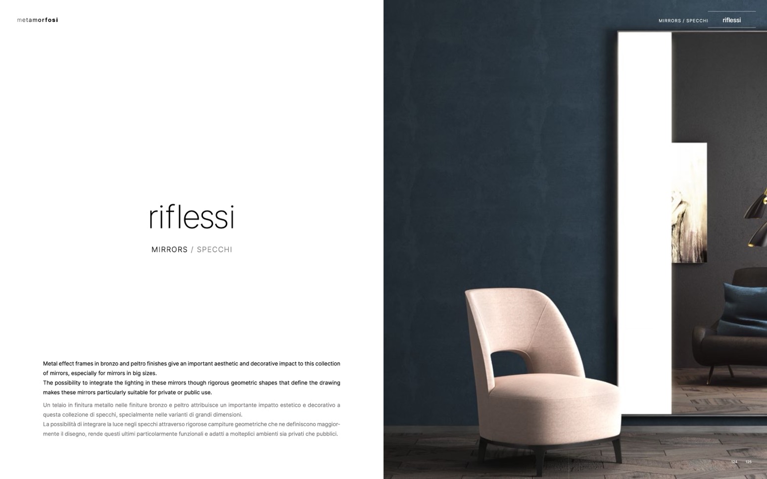 Metal effect frames in bronzo and peltro finishes give an important aesthetic and decorative impact to this collection