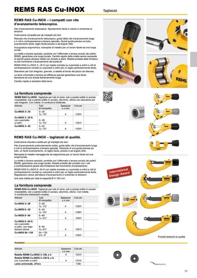 REMS RAS Cu-INOX. Tagliatubi per tubi di rame, tubi a parete sottile in acciaio
