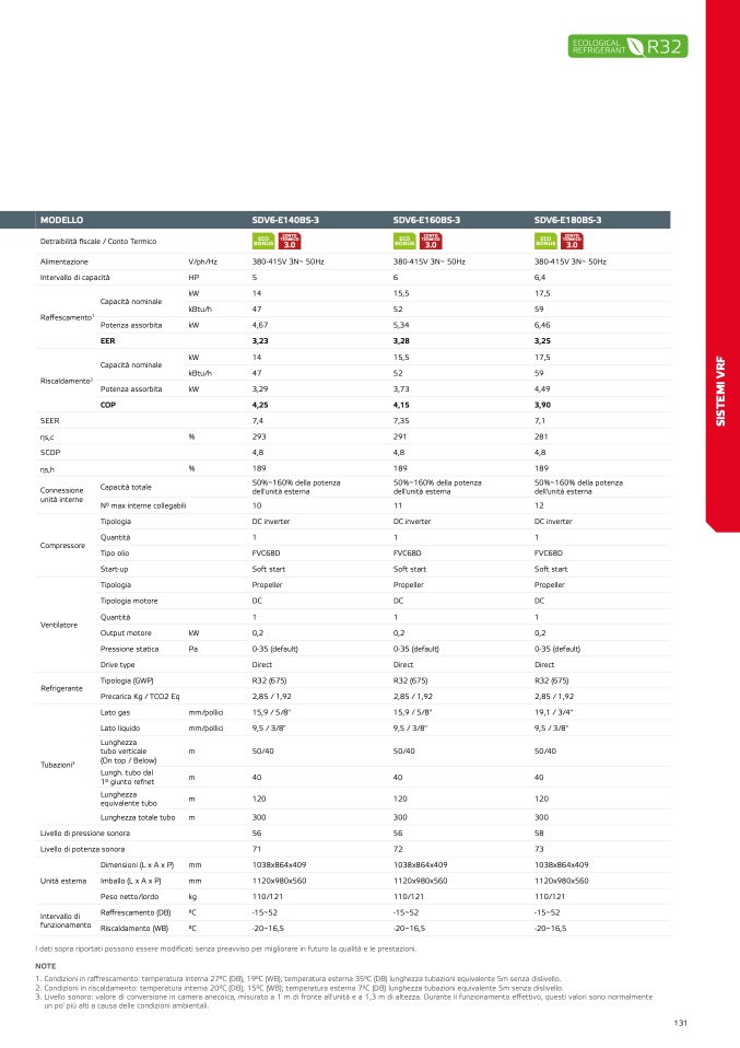 2. Condizioni in riscaldamento: temperatura interna 20°C (DB), 15°C (WB); temperatura esterna 7°C (DB) lunghezza tubazioni equivalente 5m senza dislivello