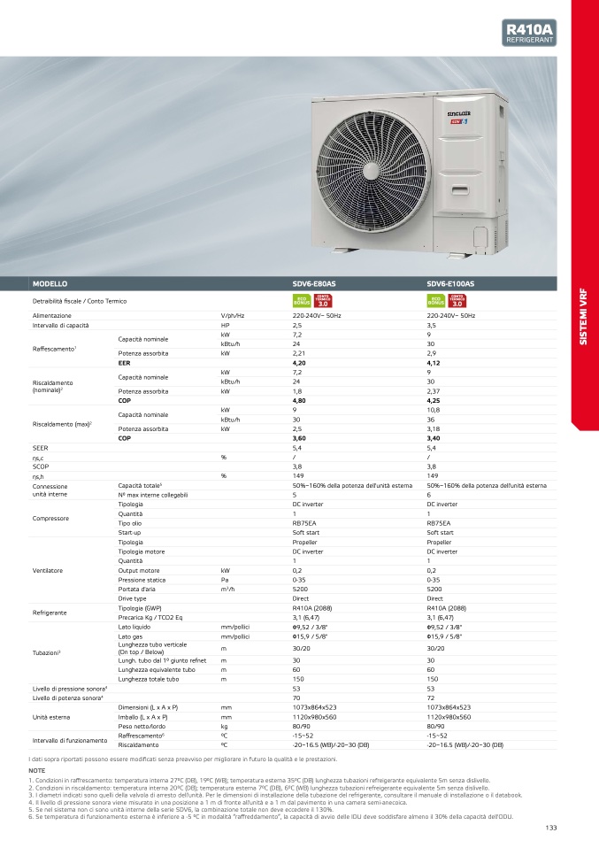 2. Condizioni in riscaldamento: temperatura interna 20°C (DB); temperatura esterna 7°C (DB), 6°C (WB) lunghezza tubazioni refreigerante equivalente 5m senza dislivello.