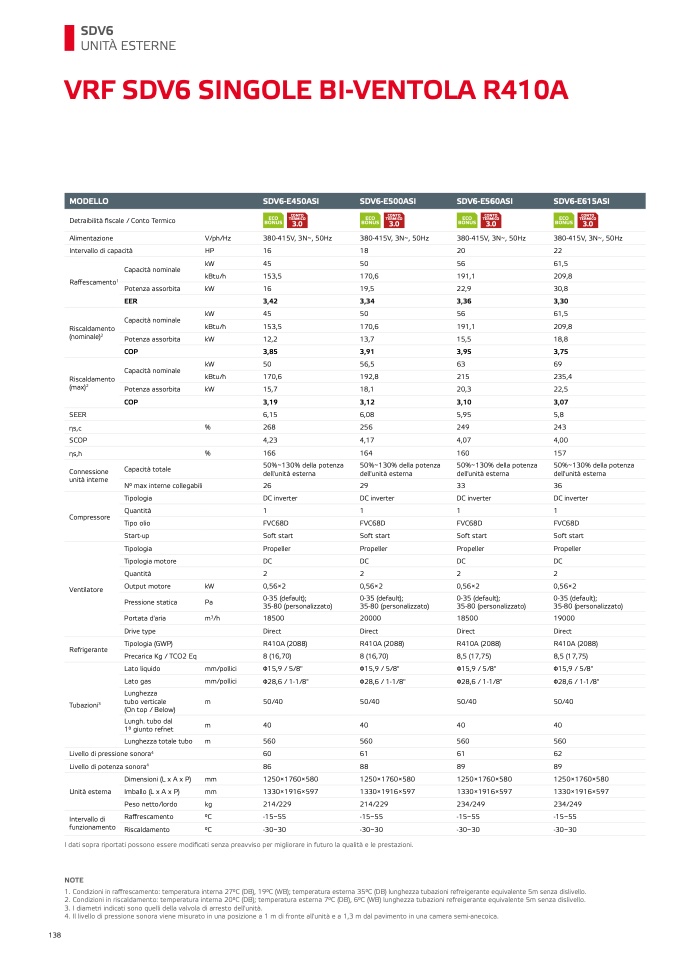 2. Condizioni in riscaldamento: temperatura interna 20°C (DB); temperatura esterna 7°C (DB), 6°C (WB) lunghezza tubazioni refreigerante equivalente 5m senza dislivello.