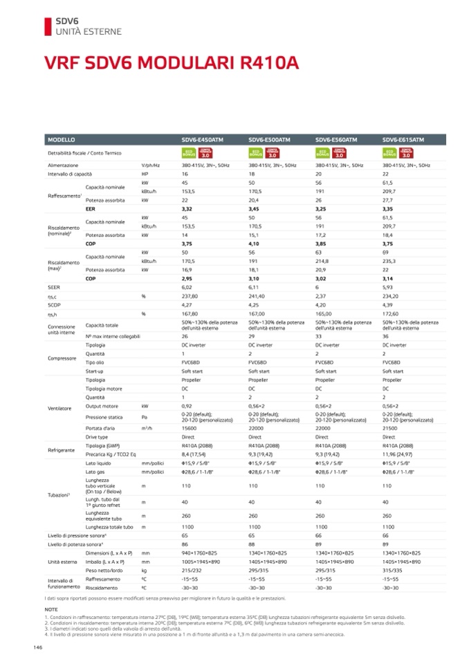 ffrescamento: temperatura interna 27°C (DB), 19°C (WB); temperatura esterna 35°C (DB) lunghezza tubazioni refreigerante equivalente 5m senza dislivello.
