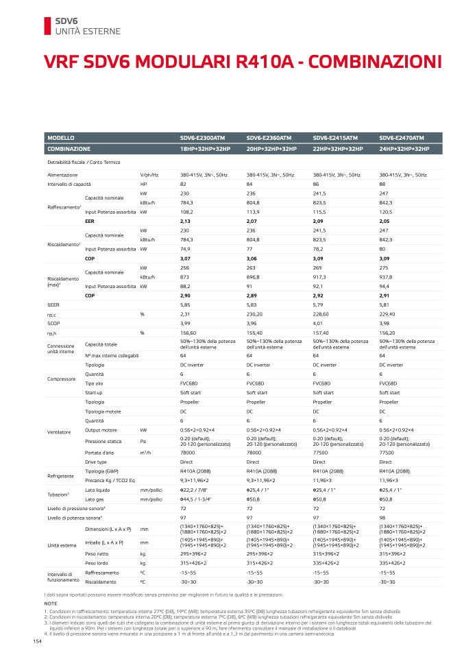 1. Condizioni in raffrescamento: temperatura interna 27°C (DB), 19°C (WB); temperatura esterna 35°C (DB) lunghezza tubazioni refreigerante equivalente 5m senza dislivell