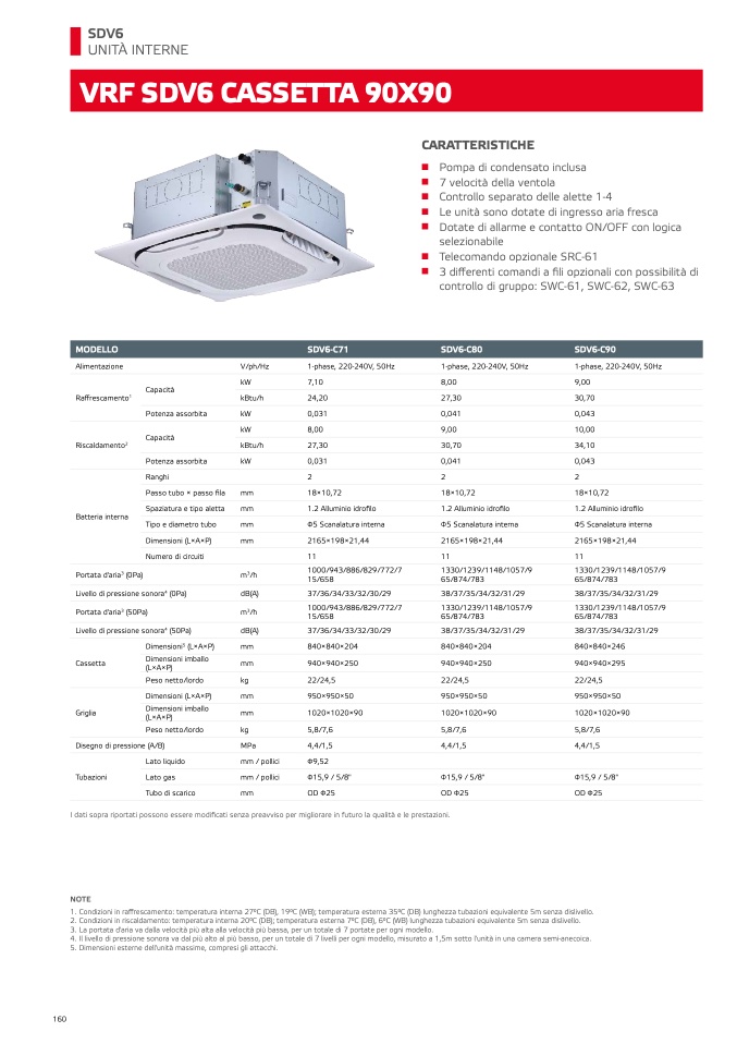 2. Condizioni in riscaldamento: temperatura interna 20°C (DB); temperatura esterna 7°C (DB), 6°C (WB) lunghezza tubazioni equivalente 5m senza dislivello.
