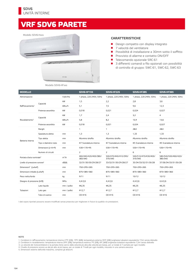 2. Condizioni in riscaldamento: temperatura interna 20°C (DB); temperatura esterna 7°C (DB), 6°C (WB) lunghezza tubazioni equivalente 7,5m senza dislivell