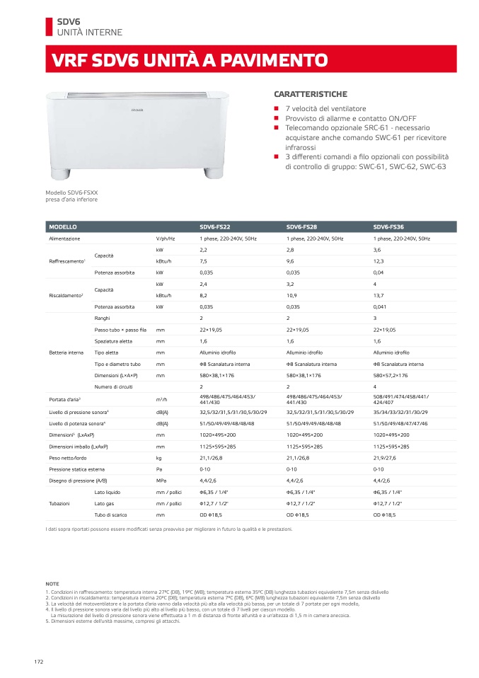 1. Condizioni in raffrescamento: temperatura interna 27°C (DB), 19°C (WB); temperatura esterna 35°C (DB) lunghezza tubazioni equivalente 7,5m senza dislivello
