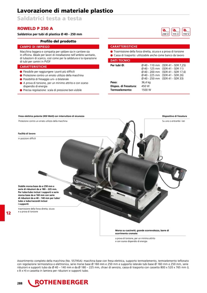 riduzioni e supporti tubo da Ø 40 – 140 mm e da Ø 180 – 225 mm, chiavi di servizio, cassa di trasporto con cassetto 800 x 520 x 765 mm (L
