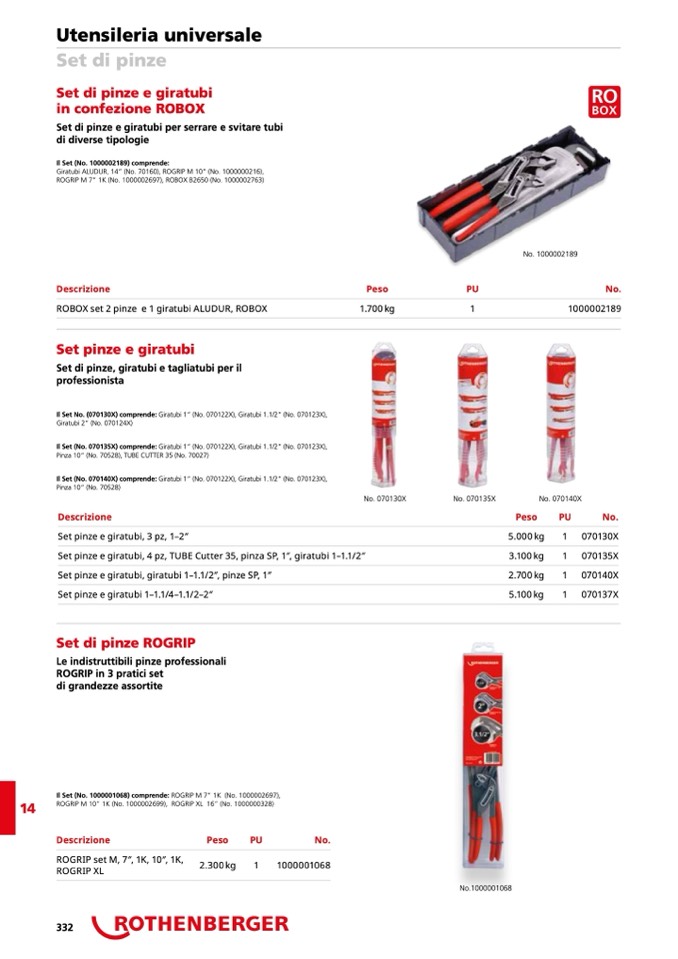 Il Set (No. 070135X) comprende: Giratubi 1“ (No. 070122X), Giratubi 1.1/2“ (No. 070123X),