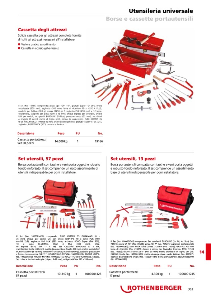 Il set (No. 19166) comprende: pinza tipo “SP“ 10“, giratubi Super “S“ (1“), livella