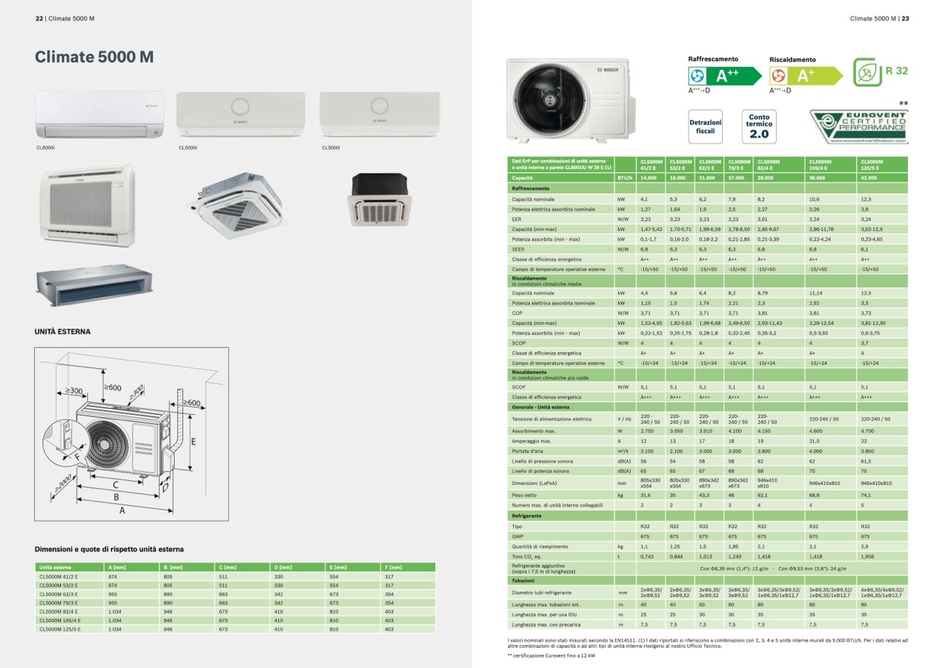 I valori nominali sono stati misurati secondo la EN14511. (1) I dati riportati si riferiscono a combinazioni con 2, 3, 4 e 5 unità interne murali da 9.000 BTU/h. Per i dati relativi ad