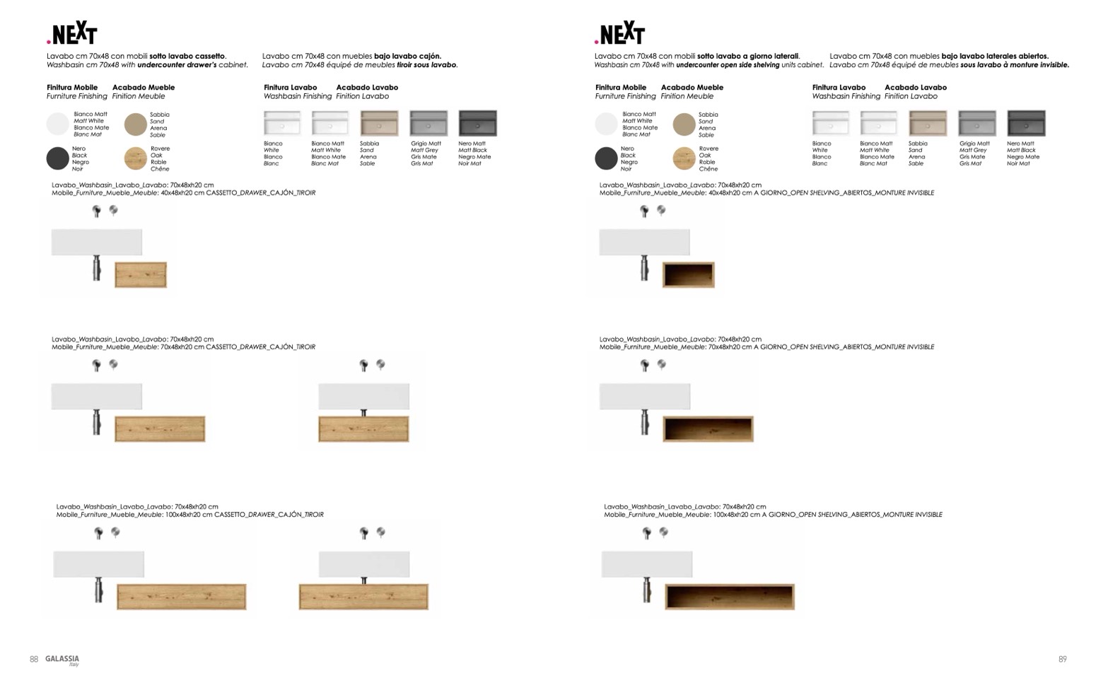 Washbasin cm 70x48 with undercounter open side shelving units cabinet. Lavabo cm 70x48 équipé de meubles sous lavabo à monture invisible.