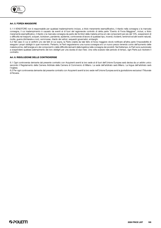 6.1 Ogni controversia derivante dal presente contratto con Acquirenti aventi la loro sede al di fuori dell’Unione Europea sarà decisa da un arbitro unic