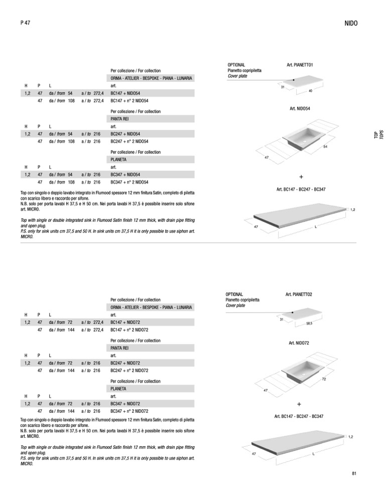N.B. solo per porta lavabi H 37,5 e H 50 cm. Nei porta lavabi H 37,5 è possibile inserire solo sifone