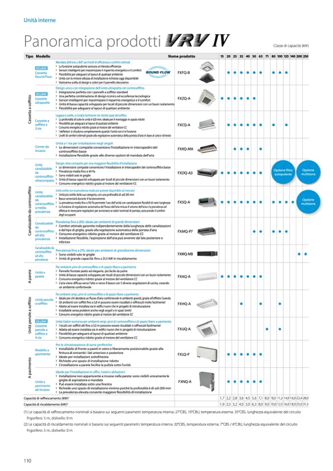 (1) Le capacità di raffrescamento nominali si basano sui seguenti parametri: temperatura interna: 27°CBS, 19°CBU, temperatura esterna: 35°CBS, lunghezza equivalente del circuito