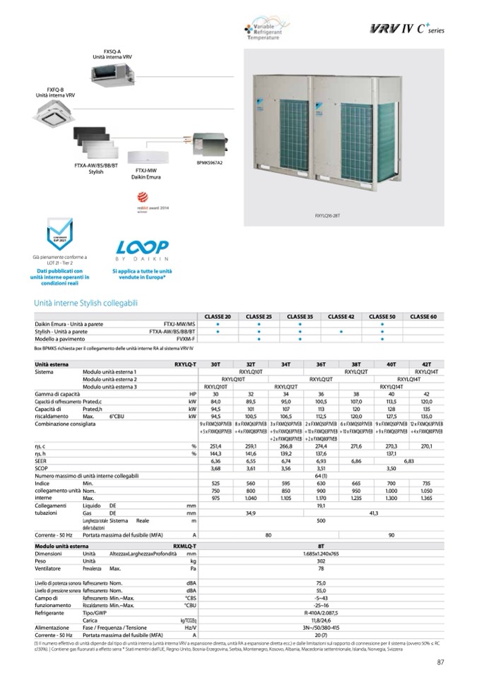 (1) Il numero effettivo di unità dipende dal tipo di unità interna (unità interna VRV a espansione diretta, unità RA a espansione diretta ecc.) e dalle limitazioni sul rapporto di connessione per il sistema (ovvero 50% ≤ RC