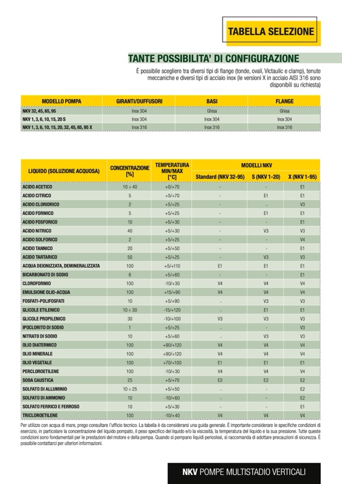 Per utilizzo con acqua di mare, prego consultare l’ufficio tecnico. La tabella è da considerarsi una guida generale. È importante considerare le specifiche condizioni di