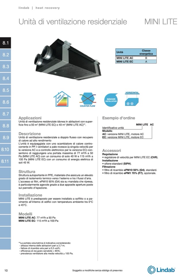 Pa (MINI LITE AC) con un consumo di solo 40 W e 115 m3/h a