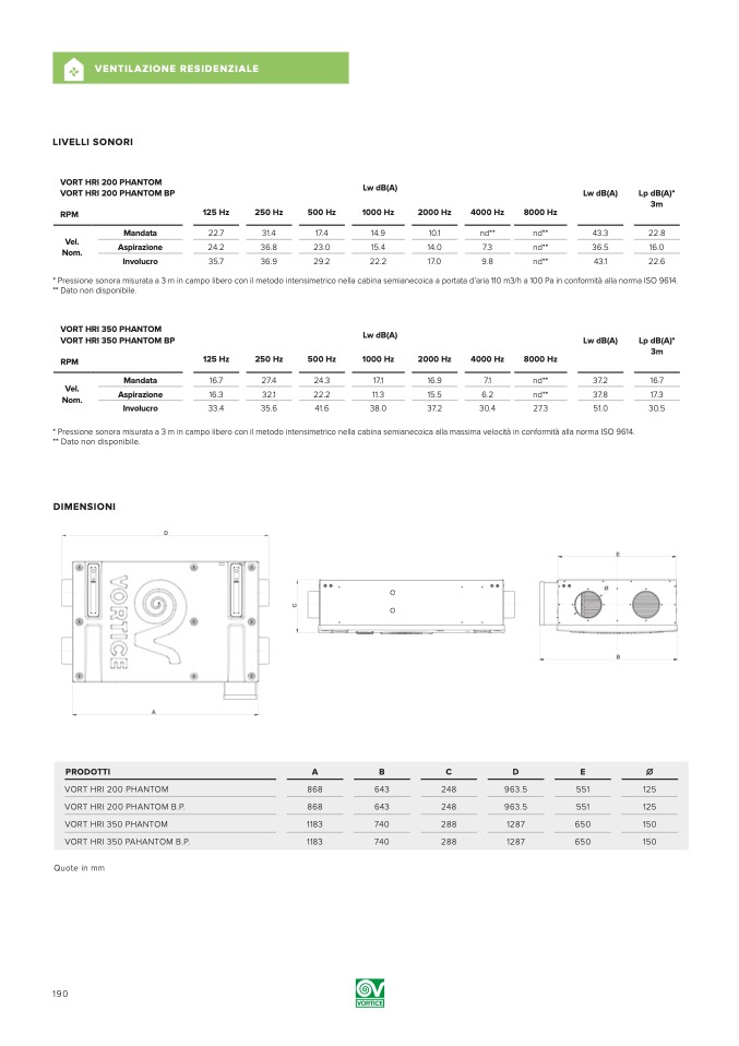 * Pressione sonora misurata a 3 m in campo libero con il metodo intensimetrico nella cabina semianecoica a portata d’aria 110 m3/h a 100 Pa in conformità alla norma ISO 9614.