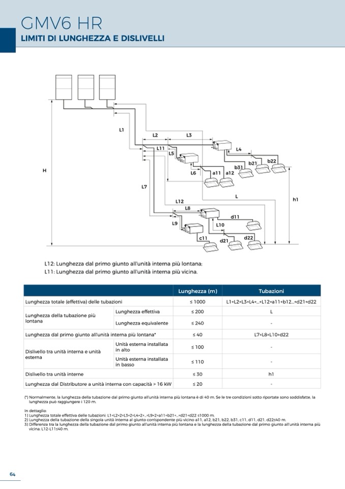 2) Lunghezza della tubazione della singola unità interna al giunto corrispondente più vicino a11, a12, b21, b22, b31, c11, d11, d21, d22≤40 m.