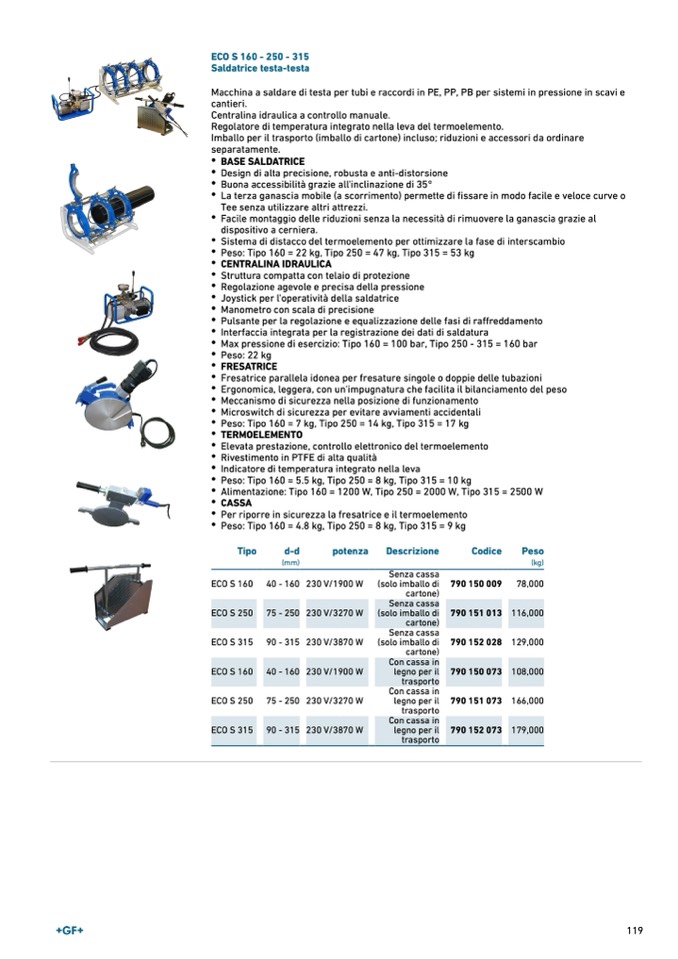 Alimentazione: Tipo 160 = 1200 W, Tipo 250 = 2000 W, Tipo 315 = 2500 W